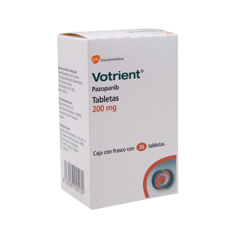 Votrient 200 mg es un medicamento especializado indicado para el cáncer renal avanzado y para algunos tipos de sarcoma de tejidos blandos. Su principio activo, el pazopanib, pertenece a los inhibidores de tirosina quinasa, una clase de fármacos diseñados para bloquear señales celulares que permiten el crecimiento de tumores. Este producto destaca dentro de los tratamientos oncológicos modernos por su acción selectiva y su eficacia comprobada.